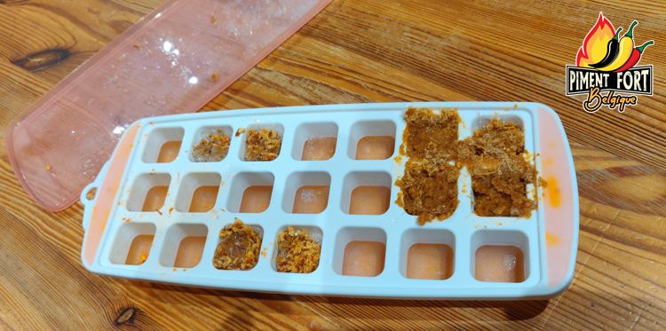 Vous pouvez aussi congeler de la purée de piment dans des petits bacs à glaçon. Au début je me suis mis à faire ça car j'avais un mixeur qui ne mixait pas comme je voulais, je passais alors la sauce au tami et donc j'avais des résidus, que je ne voulais pas jetter !, j'ai donc mis ces "déchets" dans les bacs à glaçon. Au final c'est bien pratique quand on veut en jetter quelques un dans une poelée !